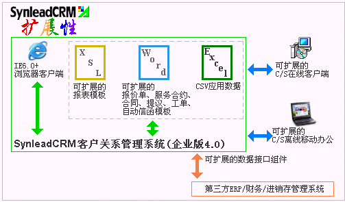 在中國(guó)CRM品牌軟件中,SynleadCRM可能是唯一的、最好的、支持"B/S+C/S雙架構(gòu)"和"在線辦公+離線辦公"應(yīng)用的產(chǎn)品,SynleadCRM企業(yè)版4.0使得用戶能夠按照最方便自己的方式擴(kuò)展應(yīng)用。