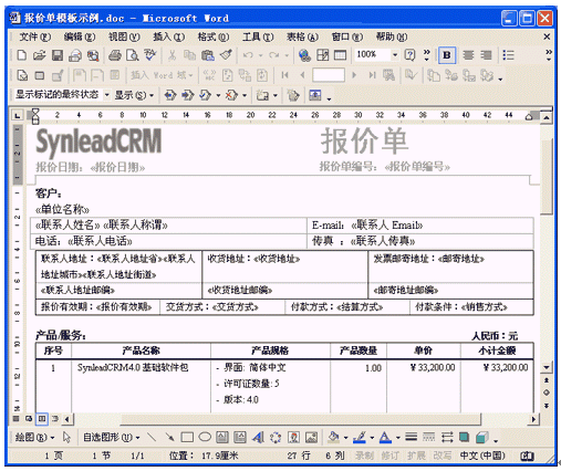SynleadCRM企業(yè)版4.0很好地滿足了銷售自動(dòng)化管理、服務(wù)自動(dòng)化管理的上述需求,提供了開(kāi)放的客戶化Word模板,使得用戶企業(yè)能夠根據(jù)實(shí)際情況不斷擴(kuò)展該應(yīng)用?蛻艋0逯苯釉赪ord中編輯,可直觀、方便地插入合并域字段或代碼,只要對(duì)Word稍加了解就可勝任模板維護(hù)工作。