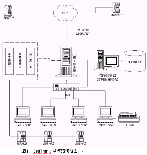 正是基于以上考慮,北京強(qiáng)訊公司根據(jù)多年來在企業(yè)級辦公自動化通信領(lǐng)域積累的經(jīng)驗(yàn),推出了"CallThink 企業(yè)級呼叫中心系統(tǒng)",該系統(tǒng)充分考察大多數(shù)企業(yè)的實(shí)際情況,本著合理利用現(xiàn)有設(shè)備,以最小的投入獲取最大的效益的原則,包含了自動呼叫分配(ACD)、交互式語音應(yīng)答(IVR)、計算機(jī)語音集成(CTI)、客戶關(guān)系管理(CRM)等業(yè)務(wù)。