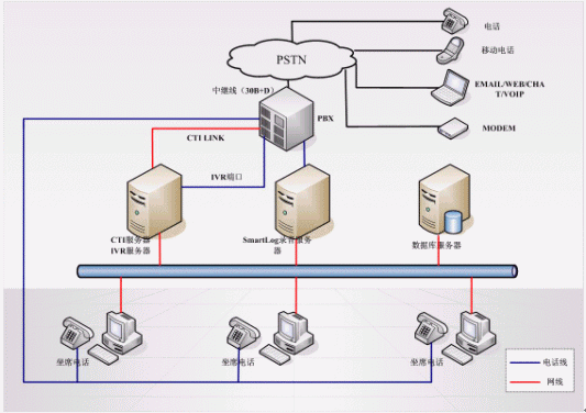 呼叫中心前端通信平臺(tái),主要由SIEMENS HiPath系列交換機(jī),計(jì)算機(jī)電話集成服務(wù)器(UltraCTI),交互式語(yǔ)音應(yīng)答服務(wù)器(ctsIVR),在線錄音監(jiān)聽服務(wù)器(SmartLog),數(shù)據(jù)庫(kù)服務(wù)器,MCI服務(wù)器以及傳真服務(wù)器幾個(gè)部分組成。中繼線多采用30B+D或2B+D接入。