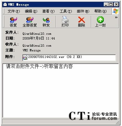 A、電子郵件檢索:語(yǔ)音留言可以以Email方式,發(fā)送到信箱主人的郵箱中,用戶可以使用Outlook、Foxmail或其它郵件方式,以附件方式收取個(gè)人的語(yǔ)音留言,通過(guò)PC上的揚(yáng)聲器、耳機(jī)來(lái)收聽(tīng)消息。