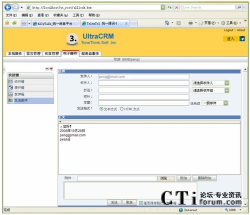 電子郵箱具有與Notes或OutLook相同的功能,可以通過(guò)設(shè)定Email服務(wù)的參數(shù),實(shí)現(xiàn)公司內(nèi)部收發(fā)Email,或通過(guò)Email服務(wù)器實(shí)現(xiàn)與Internet的通信。