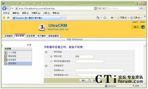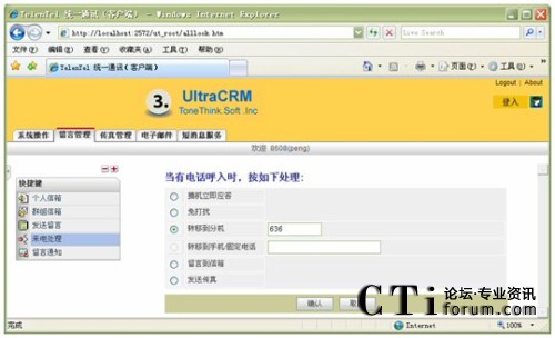 信箱主人通過(guò)Web方式的客戶端,根據(jù)實(shí)際需要,將來(lái)話設(shè)置為轉(zhuǎn)接到不同的目標(biāo),如:語(yǔ)音信箱留言、內(nèi)部其它分機(jī)、轉(zhuǎn)移至手機(jī)、轉(zhuǎn)移至外線;