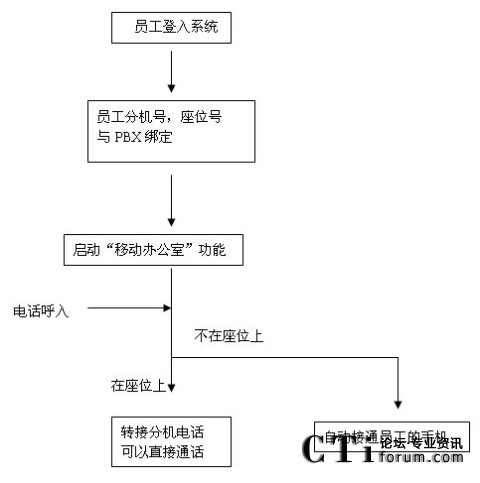 每個(gè)需要到企業(yè)辦公的員工,可以通過(guò)門(mén)禁系統(tǒng),或?qū)iT(mén)一臺(tái)PC上進(jìn)行登入,通過(guò)后由系統(tǒng)自動(dòng)分配或員工選擇一個(gè)空閑的座位,座位號(hào)與員工的分機(jī)號(hào)碼綁定,所有對(duì)這個(gè)員工分機(jī)的呼叫均被自動(dòng)轉(zhuǎn)移到其座位上的辦公電話上;