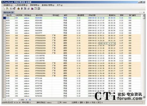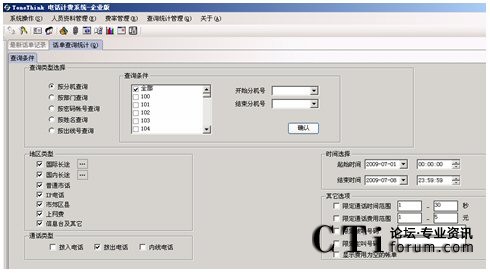 系統(tǒng)提供多種查詢條件,進(jìn)行話單明細(xì)和話單結(jié)算的統(tǒng)計(jì),如:按分機(jī)、部門(mén)、密碼、職員名稱、出現(xiàn)號(hào)碼、通話時(shí)間范圍、通話費(fèi)用范圍、制定主叫、制定被叫、不同的通話類型(國(guó)內(nèi)長(zhǎng)途、國(guó)際長(zhǎng)途、市話、IP等)。