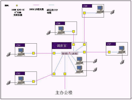 下例示圖是本產品的應用實例。示圖中CS**和調度室均為現(xiàn)場操作人員工作的控制室。通過調度室同廠辦公樓實現(xiàn)網(wǎng)絡之間的互聯(lián)。每一臺信號處理服務器帶4到8個攝像頭,主辦公樓內在現(xiàn)有的計算機上安裝了本公司的遠程監(jiān)視軟件,實現(xiàn)了管理人員及廠領導的遠程監(jiān)視的功能。
