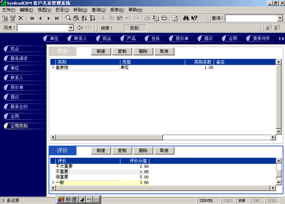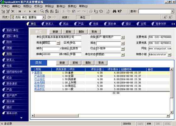 客戶單位的分類較聯(lián)系人的分類更復(fù)雜。常用的分類有:按照企業(yè)規(guī)模來分類(大、中、小,層次自定義,下同)、按照該客戶與本單位的緊密程度分類(緊密、普通、疏遠(yuǎn))、按照該客戶的重要性分類(重要、普通、次要)、按照該客戶的忠誠度分類(忠誠、普通、游移)。有一些用戶企業(yè),希望對客戶單位特征進(jìn)行采集,進(jìn)而進(jìn)行客戶信用評價(jià)。信用特征的類別可以多達(dá)數(shù)十種類(詳細(xì)情況可參考有關(guān)書籍)。利用SynleadCRM,您可以為每個(gè)類指定系數(shù),為類下屬的每個(gè)評價(jià)指定評分分值。例如,您可以建立一個(gè)類別為"客戶倉庫積壓商品的情況",系數(shù)為1,該類別下屬的評價(jià)有"很多1分"、"一般3分"、"少1分"、"未知0分",如果指定某客戶該類別的評價(jià)為一般,則該項(xiàng)目得分為3分*1(系數(shù))=3分。依此類推,您還可以指定更多的分類與評價(jià),例如:客戶經(jīng)營場所所處的位置、客戶在企業(yè)生命周期中所處的位置、客戶在行業(yè)中的地位、客戶產(chǎn)品的組合情況、客戶產(chǎn)品覆蓋的市場范圍、客戶產(chǎn)品的淡旺季規(guī)律、客戶近年?duì)I業(yè)額的增減趨勢、客戶的年度營業(yè)額、客戶的現(xiàn)金周轉(zhuǎn)能力、客戶的負(fù)債情況、客戶是否涉及中大訴訟等。每一個(gè)類別項(xiàng)目的評分經(jīng)過系數(shù)的加權(quán)運(yùn)算后,可以求和,得到這個(gè)客戶的總評分。未來也可以利用分析模型對此類數(shù)據(jù)進(jìn)行進(jìn)一步的分析,提供輔助決策所需要的圖表和報(bào)表。