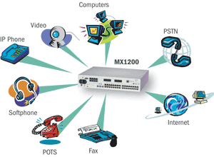 MX1200融合了Internet網(wǎng)關(包括交換和路由)和PBX(包括線路接口、模擬中繼、自動話務員、語音信箱和自動話務分配等)的功能,并支持視頻電話。系統(tǒng)使用SIP協(xié)議與局域網(wǎng)或廣域網(wǎng)上的IP設備進行通訊。這種標準的協(xié)議使得你能夠使用軟Phone或來自眾多廠商的桌面電話。