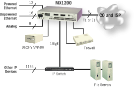你可以直接將28臺電話機和PC機與MX1200相連,其中有12路具有在線供電的能力,以確保在辦公樓停電時依然能使用電話。你可以通過外部標準的交換機,利用銅纜或者光纜將更多的用戶連接到MX1200。