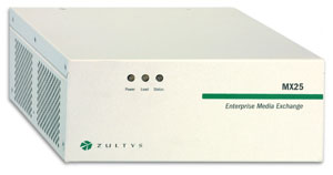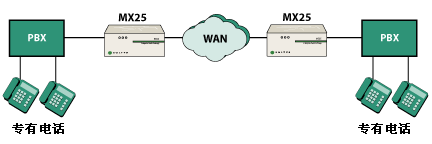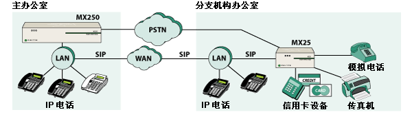 MX25 是一種能夠在兩種不同模式下工作的模塊化設(shè)備。在其中一種工作模式下,MX25 是一個通向 PSTN 網(wǎng)關(guān)的獨立 SIP。當(dāng)在這種模式下工作時,MX25 轉(zhuǎn)換電話呼叫的格式,使其可以在 IP 網(wǎng)絡(luò)與公用電話網(wǎng)絡(luò)之間傳遞。另一種工作模式是,將 MX25 作為 MX250 的功能延伸系統(tǒng),用于不超過 25 個用戶的分支辦公室。在這種配置下,MX25 與 MX250 通信并交換有關(guān)用戶和設(shè)備的信息。即使連接 MX250 和 MX25 的 WAN 鏈路出現(xiàn)故障,MX25 也能繼續(xù)工作并處理來自/發(fā)往 PSTN 的傳入/傳出呼叫。