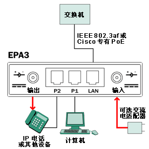 EPA3 是緊湊型適配器,允許 IP 電話或其他附件通過現有的局域網布線接收數據并為其供電,而無需修改現有的以太網基礎結構。EPA3 集成了一個 3 端口交換機,以便可以連接一個帶電源的設備以及另外一個設備。