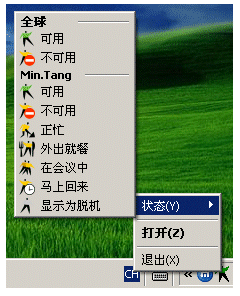 用戶可以點(diǎn)擊“設(shè)置狀態(tài)”工具欄的上圖標(biāo)或是點(diǎn)擊右下角“系統(tǒng)托盤”中的圖標(biāo)來設(shè)置自己的工作狀態(tài)。