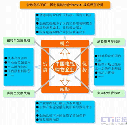 1992年至2009年以來,電視購物經(jīng)歷了從割據(jù)到統(tǒng)一,全國購物頻道網(wǎng)絡(luò)化;從粗放到科學(xué),頻道運(yùn)營模式專業(yè)化;從簡介到深度,頻道編排方式規(guī)律化、從滯后到及時(shí),物流配送體系成熟化。電視購物被譽(yù)為繼零售、超市之后的第三次銷售革命,電視購物將成為金融危機(jī)經(jīng)濟(jì)形態(tài)下未來中國電視新的經(jīng)濟(jì)增長點(diǎn),而付費(fèi)電視、數(shù)字網(wǎng)絡(luò)電視的發(fā)展,是中國電視購物市場(chǎng)新的戰(zhàn)略機(jī)會(huì)。金融危機(jī)下的中國電視購物企業(yè)SWOT戰(zhàn)略模型分析如下: