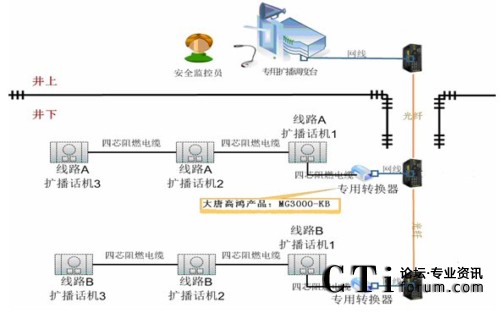 系統(tǒng)采用全分布式控制結(jié)構(gòu)。主要由專用防爆轉(zhuǎn)換器(MG3000-KB)、防爆擴(kuò)播電話機(jī)、隔爆兼本安型電源和專用擴(kuò)播調(diào)度臺構(gòu)成。專用擴(kuò)播調(diào)度臺位于地面中央控制室,專用擴(kuò)播調(diào)度臺與專用轉(zhuǎn)換器之間采用工業(yè)以太網(wǎng)絡(luò)連接,專用防爆轉(zhuǎn)換器與防爆擴(kuò)播電話機(jī)之間采用總線結(jié)構(gòu)聯(lián)接。