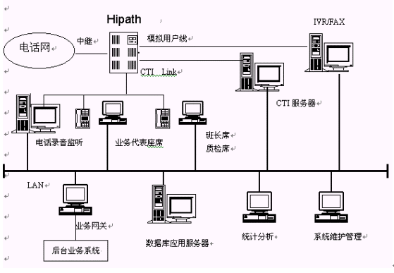主要包括:Siemens Hipath 3000系列交換機(jī)、CTI服務(wù)器、IVR/FAX服務(wù)器、業(yè)務(wù)代表座席、班長和質(zhì)檢座席、電話錄音監(jiān)聽系統(tǒng)、數(shù)據(jù)庫應(yīng)用服務(wù)器、業(yè)務(wù)網(wǎng)關(guān)、統(tǒng)計分析工作站、系統(tǒng)維護(hù)管理工作站、網(wǎng)絡(luò)系統(tǒng),其邏輯結(jié)構(gòu)下圖所示。