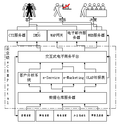 交互式電子商務(wù)平臺:負責將企業(yè)內(nèi)部的系統(tǒng)和企業(yè)的電子渠道(如:WEB、電子郵件、WAP、手機短消息和呼叫中心(Call Center)等)與企業(yè)內(nèi)部的業(yè)務(wù)系統(tǒng)(如:銷售系統(tǒng)、ERP系統(tǒng))等連接起來共同為客戶提供更為有效的服務(wù)。