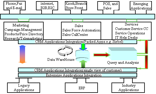傳統(tǒng)的數(shù)據(jù)庫及中間件軟件廠商,都能提供一些“point solution”(指基于某一單獨技術(shù)領(lǐng)域),例如,單獨的客戶服務(wù)CallCenter方案,數(shù)據(jù)倉庫/商業(yè)智能BI解決方案。Compaq向客戶提供的是完整的CRM方案套件,其技術(shù)組成主要包括前端的基于多種接觸媒體(phone,fax,email,web)CallCenter;核心部分的Sales Force Automation,Marketing Automation,Service Operation;以及后端的DataWareHouse/BI,ERP及原有集成應(yīng)用系統(tǒng)(Legacy Application)的集成等部分。通過下圖我們將詳細描述康柏的整體CRM方案框架及其解決方案: