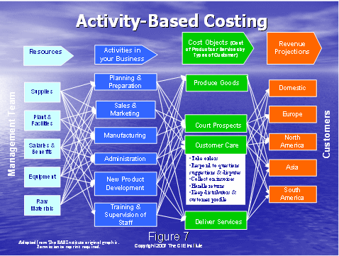 通過了解圖8,我們將以行動成本管理大體是什么的總括作為結(jié)束。我們從左邊的成本驅(qū)動因素開始——這是做工作的原因,例如:獲得客戶,維持客戶。就如圖4中所說的,這些成本驅(qū)動因素可以細(xì)分到工作行動上去?梢酝ㄟ^描述人,培訓(xùn),設(shè)備和技術(shù)資源來組成工作行動。資源驅(qū)動因素被用于分配這些企業(yè)成本到各個行動上去。下一步就是系統(tǒng)地確定行動驅(qū)動因素,分配行動成本到成本對象上去,這有利于決策的制定。例如,獲得一個客戶和維持一個客戶需要花費(fèi)多少的成本?