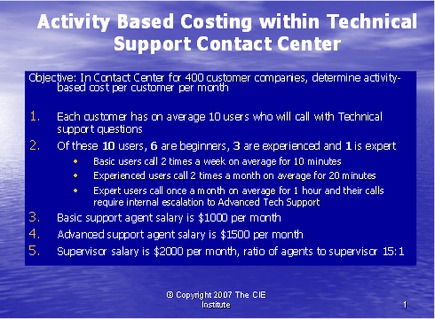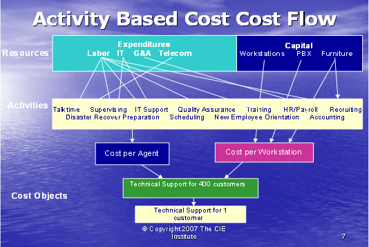 呼叫中心業(yè)務(wù)包括大量單獨(dú)的行動(dòng) — 行動(dòng)成本法(ABC)使我們跟蹤那些行動(dòng)以至于更清楚地了解支持一個(gè)客戶的所需事項(xiàng)。傳統(tǒng)上,呼叫中心成本是根據(jù)投入來衡量的:人數(shù),設(shè)備量,設(shè)施的規(guī)模。為了了解服務(wù)一個(gè)客戶所花費(fèi)的成本量,呼叫中心的主管必須確定這些行動(dòng)如何與該客戶相聯(lián)系的。只有做到這一點(diǎn),行業(yè)才能知道來自該客戶的收入是否超出為其提供服務(wù)所產(chǎn)生的成本。如果服務(wù)的成本大于收入,那么這個(gè)客戶對(duì)于行業(yè)來說是無(wú)利可圖的,所以確定哪些客戶有利可圖和哪些客戶無(wú)利可圖是很重要的,這樣,行業(yè)才可以根據(jù)客戶定價(jià)和客戶服務(wù)策略有利地進(jìn)行管理。