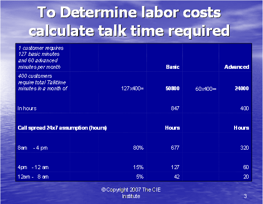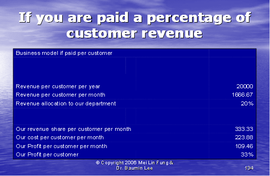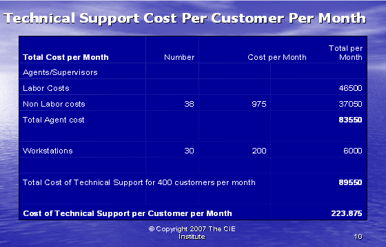 根據(jù)圖表12,我們可以算出第二種方式的利潤(rùn)百分比。如果我們假設(shè)每個(gè)客戶每年的收入是20,000美元,其中分配給呼叫中心部門的收入是20%。我們每個(gè)客戶每月的收入是333.33美元,每個(gè)客戶月的成本是223.88美元(參見圖表10)。這導(dǎo)致我們來自每個(gè)客戶每月的利潤(rùn)是109.46美元——這將產(chǎn)生33%的利潤(rùn)率。