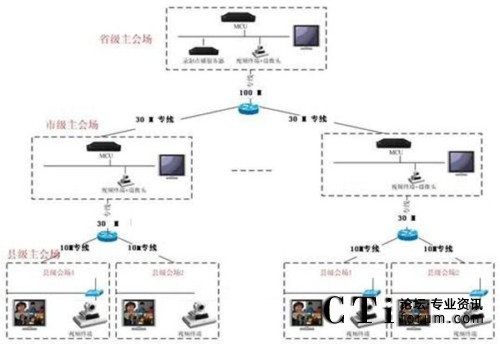 本方案整體采用基于IP網絡,在省、市中心機房放置MCU,通過網線接入核心交換網絡;在會議室放置視頻終端,通過郵政專網進行互聯。一級系統(tǒng)以省中心會議室為主會場,下屬各市會議室為分會場組成邏輯星形拓撲結構;二級系統(tǒng)以市州郵政局會議室為主會場,下屬各區(qū)縣郵政局會議室為分會場。兩級系統(tǒng)通過MCU級聯互通,形成一個樹形的拓撲結構。系統(tǒng)主要由全視頻會議管理系統(tǒng)、純硬件MCU、純硬件1080P高清會議終端等組成,采用MCU為中心的星形結構建立一個數字連接的、專業(yè)的視頻會議系統(tǒng)。視頻會議系統(tǒng)可由省郵政廳視頻會議中心控制,任意切換參會市、州(分中心)、縣、市、區(qū)(終端)的會議畫面。視頻會議系統(tǒng)可以指定任意參會單位發(fā)言并實現全省會場統(tǒng)一的畫面切換。視頻會議系統(tǒng)可實現省郵政局集中控制與管理,易于使用,能進行遠程管理、遠程維護、可降低維護成本。通過授權,各級單位可自行組織、控制會議,方便各級單位的使用。