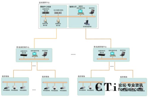 系統(tǒng)采用基于網(wǎng)絡(luò)的分布式控制結(jié)構(gòu),通過通信樓專網(wǎng)連接各機(jī)房和各營等現(xiàn)場監(jiān)控點(diǎn)。分為通信樓一級指揮調(diào)度平臺,營二級指揮調(diào)度平臺,結(jié)構(gòu)如下圖。