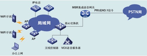企業(yè)內(nèi)部部署WLAN和語音系統(tǒng)。企業(yè)員工使用WLAN/GSM雙模手機可在WLAN覆蓋區(qū)優(yōu)先通過WiFi網(wǎng)絡(luò)實現(xiàn)內(nèi)部通話,參加電話會議,也可撥打PSTN外線電話,代替座機和手機的功能。