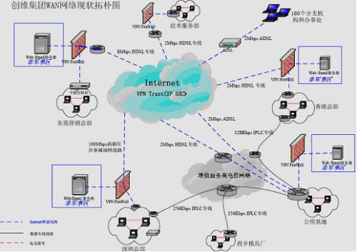 ·整個網(wǎng)絡(luò)連通性很差:隨著公司業(yè)務(wù)發(fā)展和規(guī)模擴大,現(xiàn)在整個集團(tuán)除總部外還包括13個產(chǎn)業(yè)公司和全國160個分支機構(gòu),分布在以深圳為中心的全國各個地方,目前各產(chǎn)業(yè)公司之間的網(wǎng)絡(luò)連接除深圳總部、香港、公明基地和西鄉(xiāng)模具廠四地之間是通過窄帶IPLC專線連接外,其他各地均通過Internet公網(wǎng)連接,沒有構(gòu)成統(tǒng)一的企業(yè)內(nèi)部網(wǎng)絡(luò)互連。