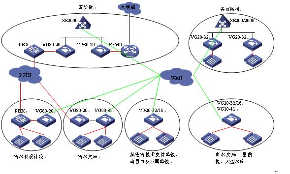 省水利設(shè)計院已經(jīng)部署了200門容量的PBX,采用語音網(wǎng)關(guān)將PBX及其下掛的模擬電話接入系統(tǒng)后,除了不需要連接水利部語音系統(tǒng)外,其組網(wǎng)與省防總完全一致,與省水利設(shè)計院連接的PBX可采用VG80-20,使用2個E1連接。