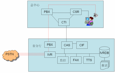 - 各分行采用IVR前置模式,通過(guò)PSTN直接接入到IVR服務(wù)器坐自動(dòng)語(yǔ)音服務(wù)。