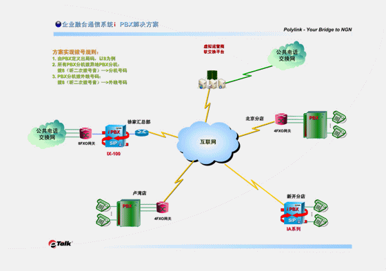 此方案實施后,用戶今后的VoIP分點擴容會十分簡單易行。當(dāng)用戶有新的分店時,分店的通訊系統(tǒng)可以直接上一臺Polylink eTalk® IA系列i PBX,它既有與PBX相同而且更多的各種功能,還具有VOIP網(wǎng)關(guān)的功能,可直接與總部的IX系統(tǒng)互相注冊,既省掉了多添置一臺語音網(wǎng)關(guān)的成本,也避免了設(shè)備的重復(fù)堆壘。