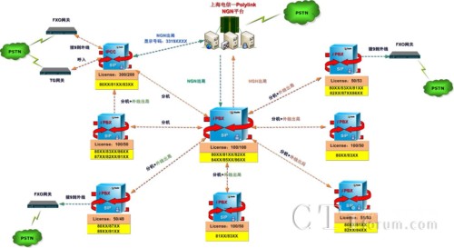 客戶采用IPCC-500型的IPCC系統(tǒng)組建一套分布式呼叫中心系統(tǒng)。它不僅實現(xiàn)呼叫中心功能,又完全取代傳統(tǒng)PBX作為核心的通信系統(tǒng)?蛻艨偛咳萘繛300門分機,另有分支機構(gòu)分別配置一臺IX-100和IX-50,作為分公司的電話交換設(shè)備。外地分部使用IX-50通過互聯(lián)網(wǎng)與總部的IPCC點對點對接,實現(xiàn)內(nèi)部互通免費?蛻舻淖撕陀脩舳丝偣布s有550門終端。