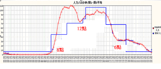 大家看到圖一中紅色的線,就是一天里面電話進來的數(shù)量,藍色的線是安排的人力?梢郧宄吹剑涸缟8點一開始,電話就一直進來;中午來電的客戶開始去吃飯,電話就開始下滑;然后等到客戶吃完中飯,電話又開始進來,下午又出現(xiàn)另外一個高峰;一直到5點以后又開始下滑,6點以后電話相對就少很多。