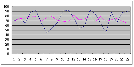 這是兩個(gè)呼叫中心從早上8點(diǎn)開(kāi)始,一直到晚上6點(diǎn),每隔半個(gè)小時(shí)的服務(wù)水平?梢院芮宄目吹,藍(lán)色這條線,它服務(wù)水平在91到48這中間震蕩,平均服務(wù)水平是73左右,粉紅色這條線,雖然平均服務(wù)水平也是在73左右,但震蕩幅度卻小了很多,服務(wù)水平只在81到68這中間震蕩。