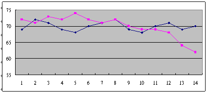這是兩個(gè)座席員每天的通話利用率,橫軸是這個(gè)月從1號(hào)開(kāi)始到14號(hào),縱軸是通話利用率,藍(lán)色這位的平均通話利用率在70左右,粉紅色這位的平均通話利用率也是在70左右,但上下震蕩的很厲害,月初表現(xiàn)的很好,但從月中開(kāi)始,通話利用率就一直明顯的下降。
