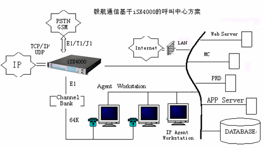 相對于現(xiàn)在的兩種主流呼叫中心方案,毅航通信基于iSX4000呼叫中心解決方案直接整合了Internet的接入。傳統(tǒng)由IVR完成的操作也可以通過Web頁面上的流程實(shí)現(xiàn),這樣用戶通過下拉菜單、簡單填寫、點(diǎn)擊按鈕等操作完成客戶識別、業(yè)務(wù)識別等操作,這些流程完成后,通過VoIP對呼叫中心呼入,由呼叫中心對呼入進(jìn)行受理,再按照相應(yīng)的原則分配到座席,座席再作相應(yīng)的應(yīng)答和處理,從而為客戶提供了一個(gè)通過Web站點(diǎn)直接進(jìn)入呼叫中心的途徑,把Internet所具有的豐富信息資源和強(qiáng)大的功能賦予呼叫中心,它向客戶提供一個(gè)可訪問的Web站點(diǎn),使得呼叫中心從“撥叫到交談(Dial to Talk)”發(fā)展到“點(diǎn)擊到交談(Click to Talk)”,通過Internet可以提供IP電話語音呼叫、Call Back、IP傳真、IM、E-mail等功能,擴(kuò)展了通信渠道,一方面用戶可以實(shí)現(xiàn)免費(fèi)接入到呼叫中心,另一方面企業(yè)能夠向更多的客戶提供優(yōu)質(zhì)、方便的服務(wù)資源,而且由于這些資源的價(jià)格相對傳統(tǒng)通信便宜,使企業(yè)為客戶提供全國、乃至于全球服務(wù)成為可能,提高了企業(yè)客戶服務(wù)水平,增強(qiáng)了企業(yè)競爭力。毅航通信統(tǒng)一呼叫中心解決方案系統(tǒng)結(jié)構(gòu)如圖所示: