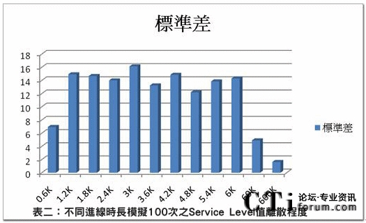 (表一:Erlang C與話務(wù)模擬之Service Level差異表)