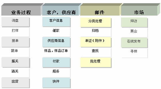 貿(mào)易的特點(diǎn),過程要規(guī)范,遵守進(jìn)出口規(guī)范,但是操作是要求足夠靈活,處處要體現(xiàn)知識專業(yè)性和操作可協(xié)調(diào)性,還有貿(mào)易的互惠互利性。貿(mào)易中文案是貿(mào)易的關(guān)鍵因素,但并非貿(mào)易工作羈絆,不是把工作變成流水線、機(jī)械化。對用戶來說,做事要靈活,搜索要方便,做單據(jù)還是使用office工具更得心應(yīng)手。OTI