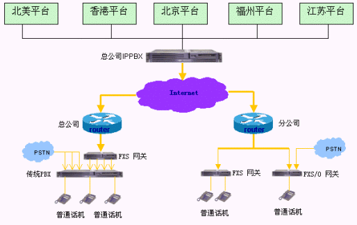- 建設(shè)企業(yè)內(nèi)部的IP電話系統(tǒng),實(shí)現(xiàn)企業(yè)內(nèi)部各個分支結(jié)構(gòu)之間的免費(fèi)通話,即總公司之間、各個分支機(jī)構(gòu)之間、總公司與各個分支機(jī)構(gòu)之間通訊免費(fèi)。由于各地電話環(huán)境不同,各個分支機(jī)構(gòu)在使用內(nèi)部通話功能時(shí)候操作有些差異。