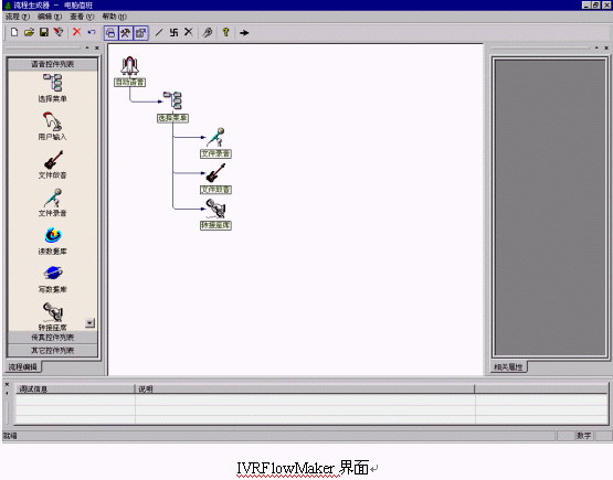 IVR流程由IVRFlowMaker定制,IVRFlowMaker提供了拖掛式的圖形化編輯界面,通過它用戶可以根據(jù)自己的需要很方便地編輯出功能強(qiáng)大的IVR流程。IVRFlowMaker支持不限個(gè)數(shù)、級(jí)數(shù)的IVR結(jié)構(gòu),可滿足用戶非常復(fù)雜的需求。