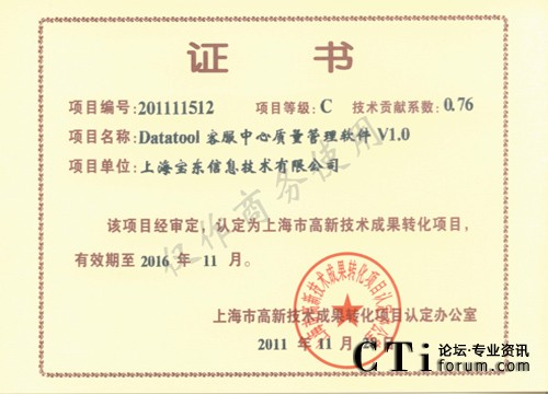 CTI論壇(ctiforum)12月7日消息(記者 張潔):2011年的最后一個(gè)月,寶東公司傳來(lái)又一好消息,公司的開發(fā)團(tuán)隊(duì)自主開發(fā)研制的針對(duì)呼叫中心客服的質(zhì)檢軟件“Datatool 客服中心質(zhì)量管理軟件(簡(jiǎn)稱DTQM)”經(jīng)過市高新技術(shù)轉(zhuǎn)化項(xiàng)目認(rèn)定辦公室層層審報(bào)審批,最終經(jīng)審定,被認(rèn)定為市高新技術(shù)成果轉(zhuǎn)化項(xiàng)目。