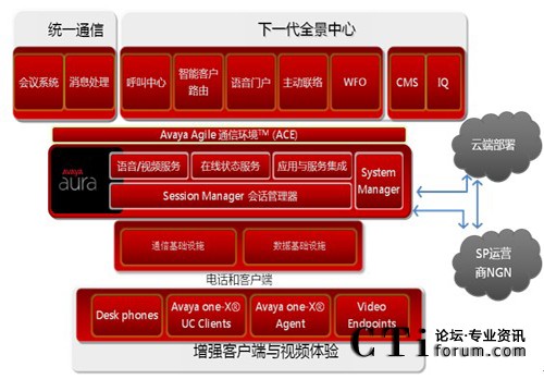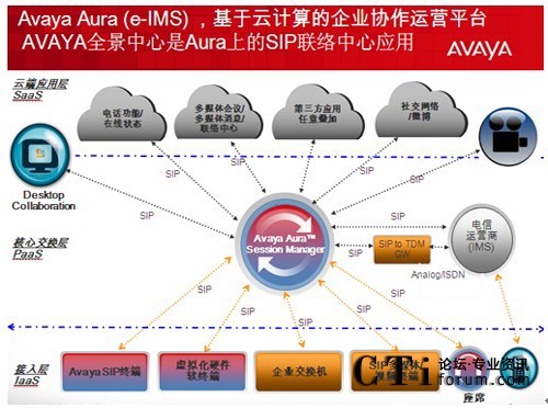 - 當(dāng)其他廠商還在爭論公有云和私有云的優(yōu)劣時,Avaya已經(jīng)開始部署企業(yè)的私有云—Avaya Aura 和運營商的公有云之間如何和諧共處;企業(yè)用戶的統(tǒng)一通信功能完全基于”按需服務(wù)激活”模式;