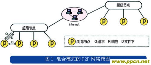 Skype是P2P技術演進到混合模式后的典型應用,它結合了集中式和分布式的特點,在網(wǎng)絡的邊緣節(jié)點采用集中式的網(wǎng)絡結構,而在超級節(jié)點之間采用分布式的網(wǎng)絡結構,混合模式的P2P網(wǎng)絡模型如圖1所示。