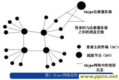 與常規(guī)的電信業(yè)務網(wǎng)絡不同的是,Skype的網(wǎng)絡中除了注冊服務器,沒有其他任何集中的服務器,只是將用戶節(jié)點分為普通節(jié)點和超級節(jié)點。Skype的系統(tǒng)連接結構如圖2所示。