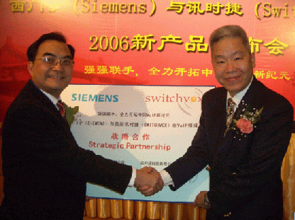 2006年3月29日的北京,還有些春風料峭,但北京長富宮的芙蓉廳卻是暖意融融,德國通訊業(yè)巨擘西門子(Siemens)和美國企業(yè)通訊業(yè)新寵訊時捷(Switchvox)聯(lián)合舉辦VoIP新產(chǎn)品發(fā)布會,西門子終端通訊設備(上海)有限公司CEO