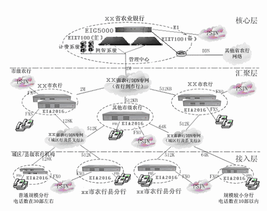 省行、各地市行與縣支行、分理處與數(shù)據(jù)業(yè)務(wù)共用專網(wǎng)線路,實(shí)現(xiàn)VOIP互連,形成一個(gè)全省范圍內(nèi)的VOIP大網(wǎng),實(shí)現(xiàn)全省內(nèi)部語音的免費(fèi)通信和內(nèi)部號(hào)碼的縮位拔號(hào),節(jié)省了各行間的市話費(fèi)用,節(jié)省大量長途話費(fèi)。各節(jié)點(diǎn)按FXO:FXS