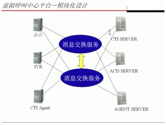 而呼叫中心平臺,則由網(wǎng)絡(luò)模塊方式組成:CTI服務(wù)器、ACD服務(wù)器、AGENT服務(wù)器、IVR服務(wù)器、錄音服務(wù)器等,這些呼叫中心平臺模塊,采用消息交換服務(wù)器的心型連接,組成統(tǒng)一的系統(tǒng),從而充分保證系統(tǒng)的靈活性、擴(kuò)充性。