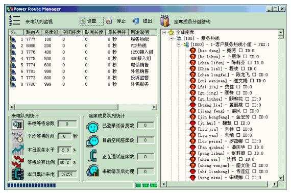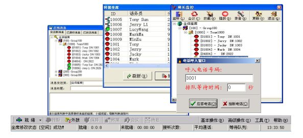 所有線路、座席狀態(tài)、操作時(shí)長的動(dòng)態(tài)監(jiān)視,動(dòng)態(tài)監(jiān)視呼叫隊(duì)列長度,并能實(shí)現(xiàn)監(jiān)聽、強(qiáng)插、強(qiáng)拆、強(qiáng)制注銷控制功能。