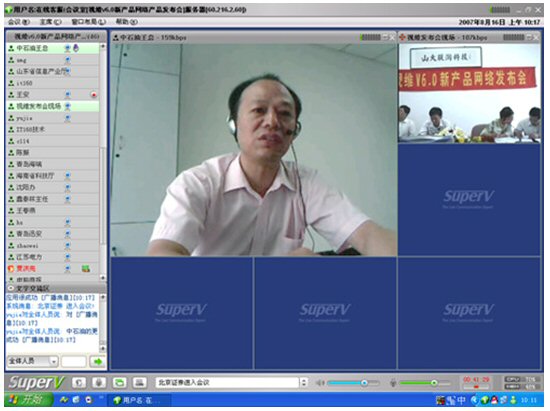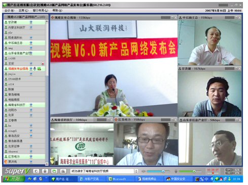 2007年8月16日,視維視頻會議V6.0新產(chǎn)品網(wǎng)絡(luò)發(fā)布會在美麗的泉城濟南舉行,山東省信息產(chǎn)業(yè)廳、濟南市信息產(chǎn)業(yè)局的領(lǐng)導(dǎo)、山東省電信等上級主管部門領(lǐng)導(dǎo),視維產(chǎn)品新老用戶和有視頻會議需求的潛在客戶,國內(nèi)外合作伙伴,IT168、中國計算機報、電腦商報、C114、支點網(wǎng)、計算機世界、CTI論壇、投影時代等國內(nèi)知名媒體100多人參加了這次網(wǎng)絡(luò)發(fā)布會。在此次會議上,山大聯(lián)潤公司通過視頻會議與各地與會者進行了良好的溝通,同時這次發(fā)布會開創(chuàng)了用視頻會議發(fā)布新產(chǎn)品的先河。