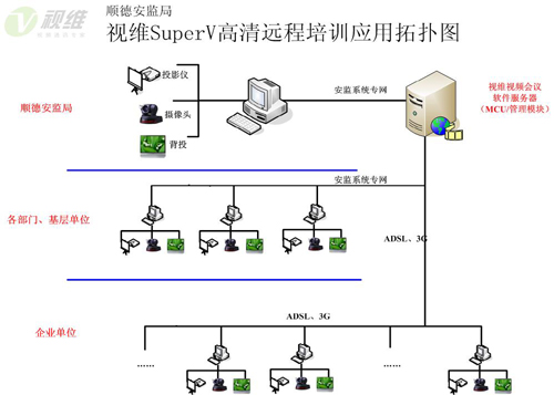 順德安監(jiān)局各部門及下屬單位使用安監(jiān)系統(tǒng)專網(wǎng)進(jìn)行連接,而重點培育企業(yè)網(wǎng)絡(luò)情況復(fù)雜,涉及ADSL以及3G無線網(wǎng)絡(luò)等多種情況,視維根據(jù)順德安監(jiān)局、局下屬單位及重點培育企業(yè)的分布情況,將服務(wù)器架設(shè)在順德安監(jiān)局總部,并在總部搭建會議室和培訓(xùn)中心,其他各部門、下屬單位和重點培育企業(yè)為分會場。